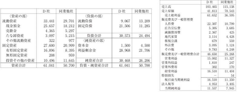 これは診断士試験で見る決算書です。試験用なので当然きれいにできています。 これは決算書の数値を同業他社と比べて課題を見つけるという問題ですが、実際の経営支援の業務でも普通は一番先に行う事項でもあります。