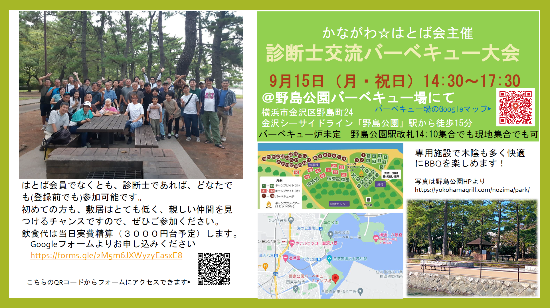 横浜市金沢区野島公園のバーベキュー場を借り、14:30から17:30の間で開催します。