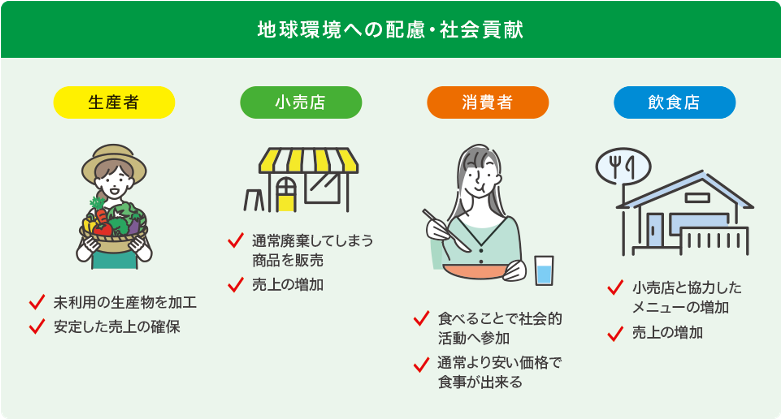 また、食品ロスというテーマを通じて、「環境」「食育」「地域活性化」といった、複数の社会課題が同時に解決されるモデルの構築をめざしています。