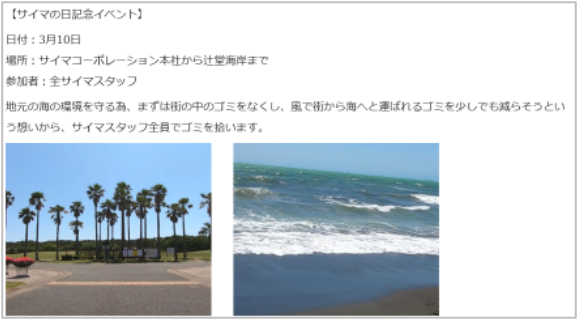 この観点での取り組みとして、会社周辺の毎日の地域清掃、湘南ユナイテッドBCへの出資を含めた支援、ビーチクリーン活動、学生への職業講話等があります。